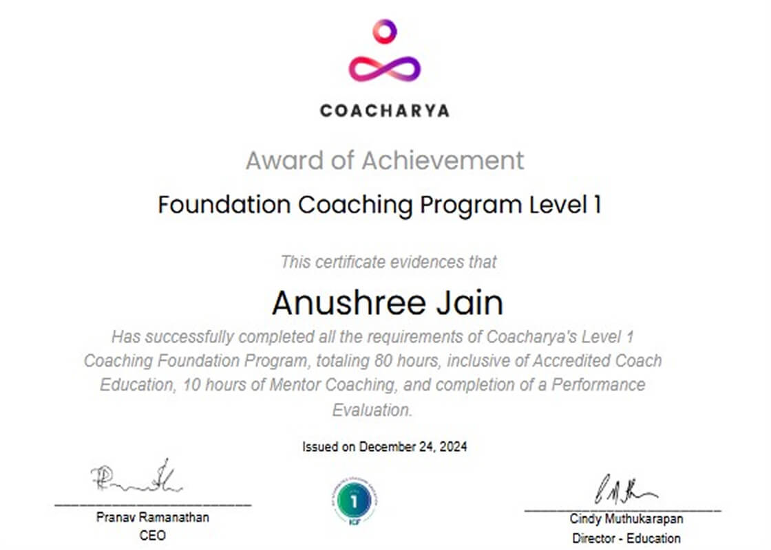 Anushree Jain’s mentorship transformed my life completely. As a Life Coach & Energy Healer, she combines wisdom, empathy & deep understanding with remarkable listening skills. Her holistic approach integrates energy healing with practical strategies in a non-judgmental environment. Anushree doesn’t just guide, she walks alongside you, offering unwavering support through every challenge. Her calm presence makes exploring complex emotions feel safe & natural. Whether seeking clarity, personal growth, or emotional balance, She provides the tools & insight to achieve your goals. Her genuine passion for helping others thrive sets her apart. I’m profoundly grateful for her impact on my life.